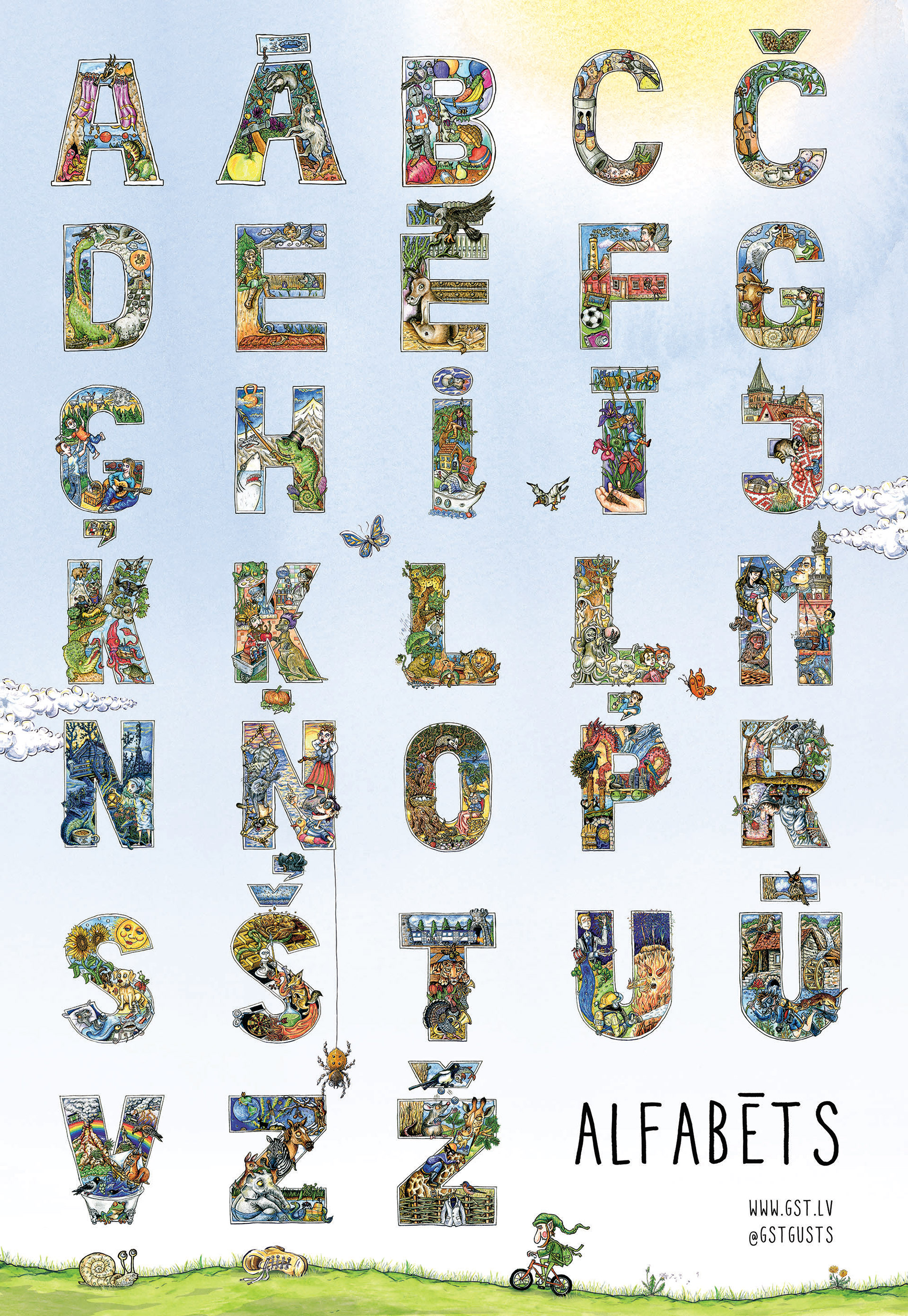 Large size poster 69x100cm with illustrated Latvian language letters.